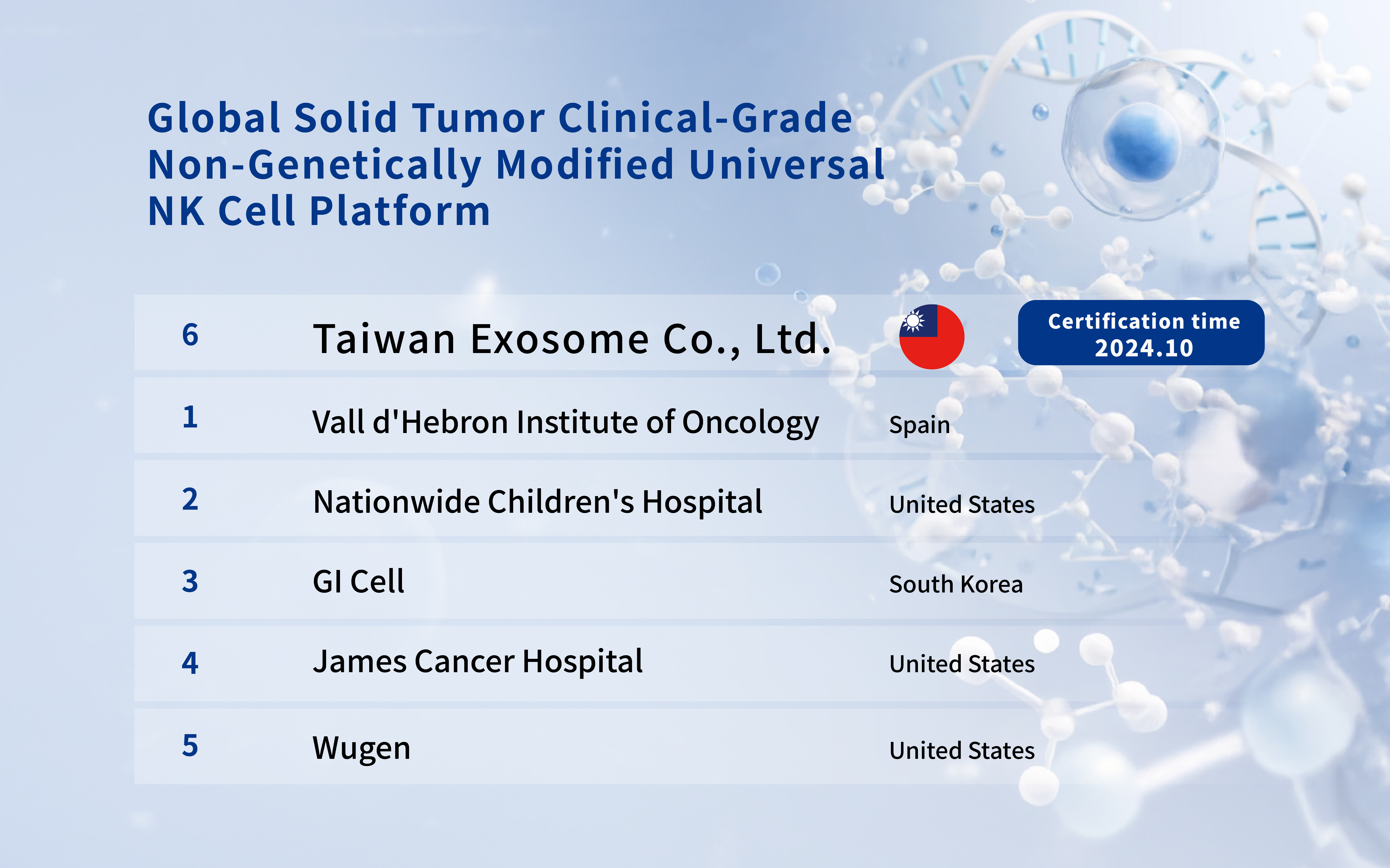 Currently, more than 60 companies are engaged in the regenerative medicine field. Among them, Taiwan Exosome is the first to obtain a clinical-grade universal (non-matching and non-gene-modified) NK cell platform in Taiwan, with comprehensive capabilities spanning clinical-grade manufacturing, quality control, and trial planning.