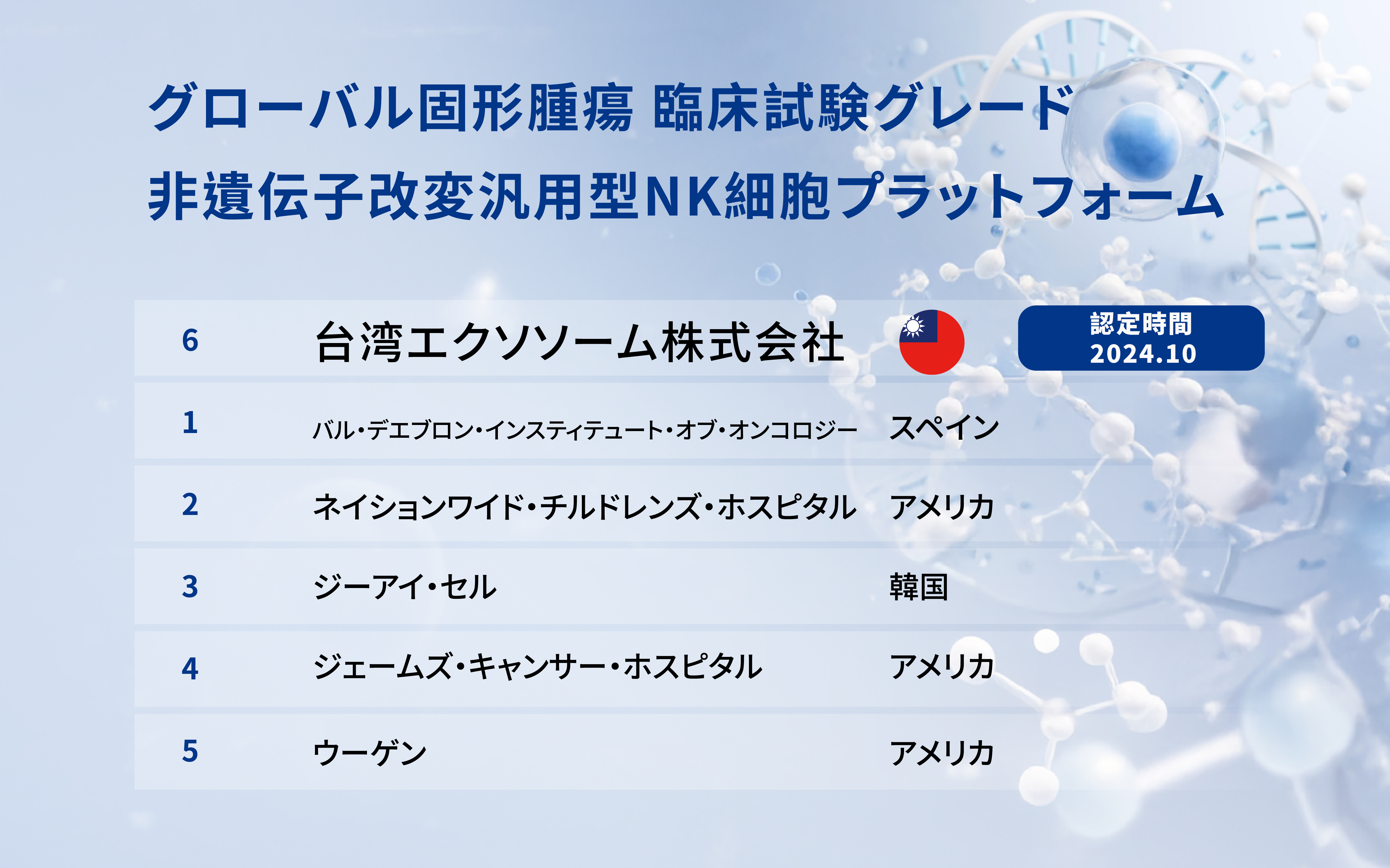 「台湾エクソソーム社が国内初の臨床グレード汎用型(非マッチング・非遺伝子改変)NK細胞プラットフォームを確立したことは、当社の技術戦略における重要なマイルストーンであり、製造・研究開発・臨床連携における統合能力を示すものです。