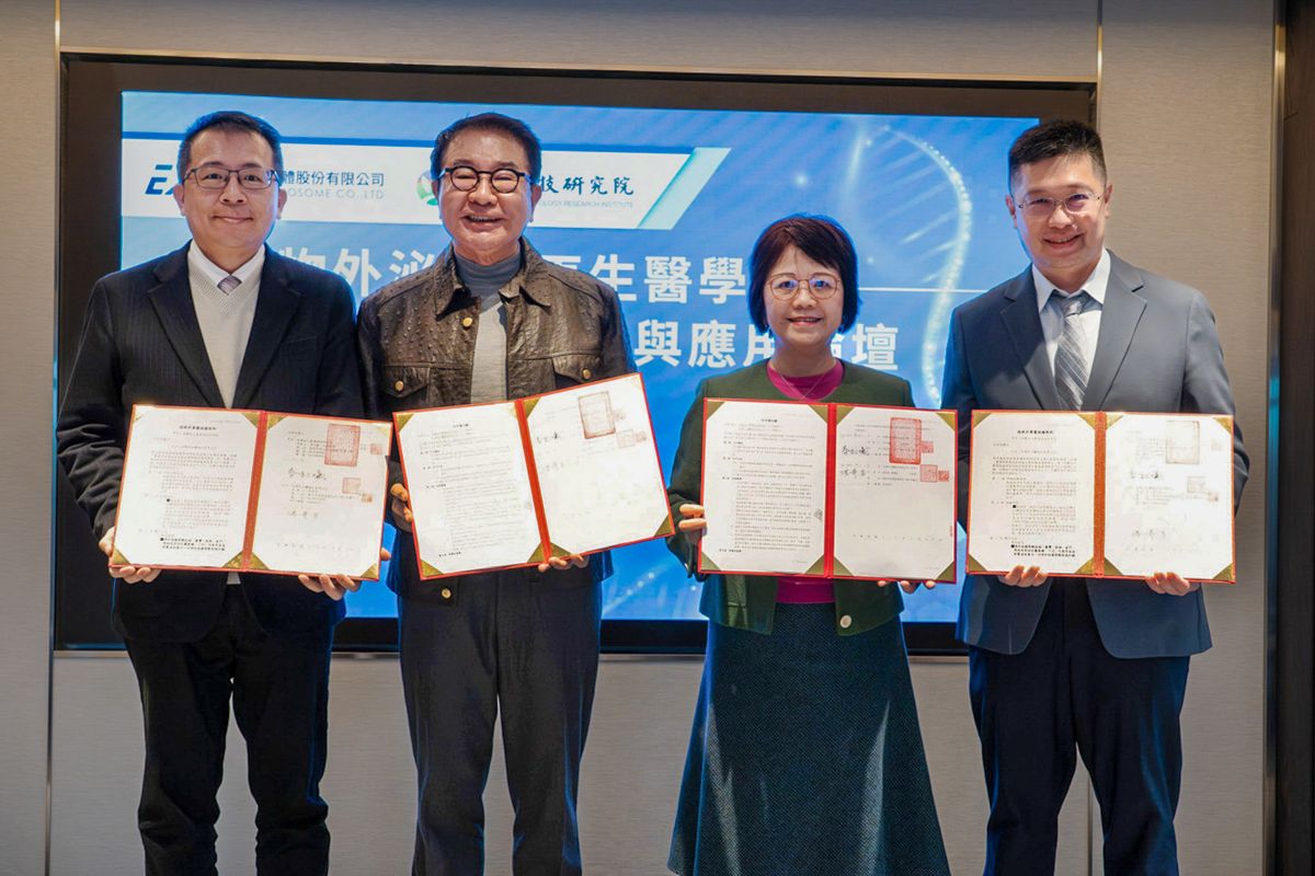 雙方於簽約完成後合影留念,照片左起為台灣外泌體股份有限公司營運長暨技術長林杰良博士、董事長洪奇昌;財團法人農業科技研究院代理院長李紅曦、農業資材與加值研究所副所長楊啟裕博士。(台灣外泌體股份有限公司提供)